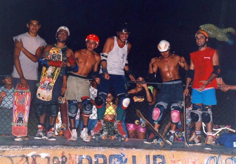 Gato(Capacete branco, sem camiseta) com Chales Reginaldo(Capacete Vermelho, sem camiseta), o Roller Eder Bicudo eamigos.Bowl da Volta da Jurema.Anos 1990