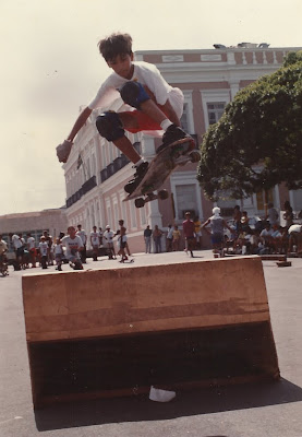 Por ser bem magro, uma grande facilidade era a contorção nas manobras. Para proteger as pernas das “skatadas”, Tibúsarcio usava joelheras nas canelas, fato que também é bastante comentado hoje. Foto em uma etapa do circuito ASKN no início dos anos 1990 em frente ao Palácio dos Esportes em Natal.